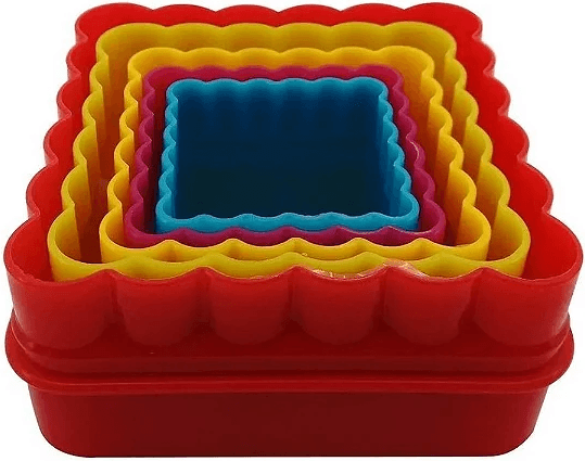 CORTADOR PLASTICO QUADRADO CAKE BRASIL CORTADOR DE PLASTICO PARA BISCOITOS, PASTA AMERICANA E MASSAS EM GERAL. COM 2 ACABAMENTOS, 1 LISO E 1 ONDULADO. TAMANHOS APROXIMADOS: 7,5 X 3. 6,5 X 3. 5 X 3. 4,5 X 3. 3,5 X 3.