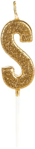 VELA PEQUENA COM GLITTER DOURADO LETRA S SILVER FESTAS
